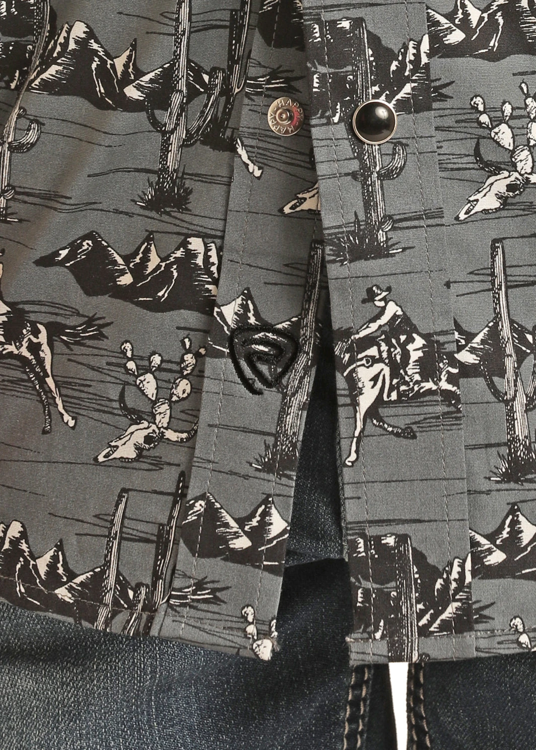 Grey Long Sleeve Snap Front Shirt with All Over Western Print.