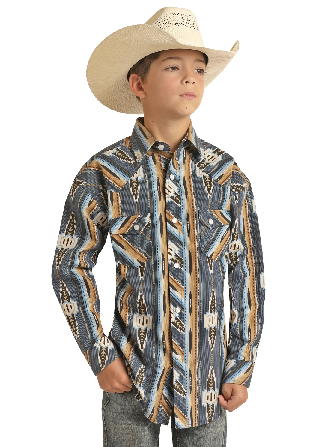 Blue and Tan Vintage Aztec Stripe Long Sleeve Snap Front Shirt.