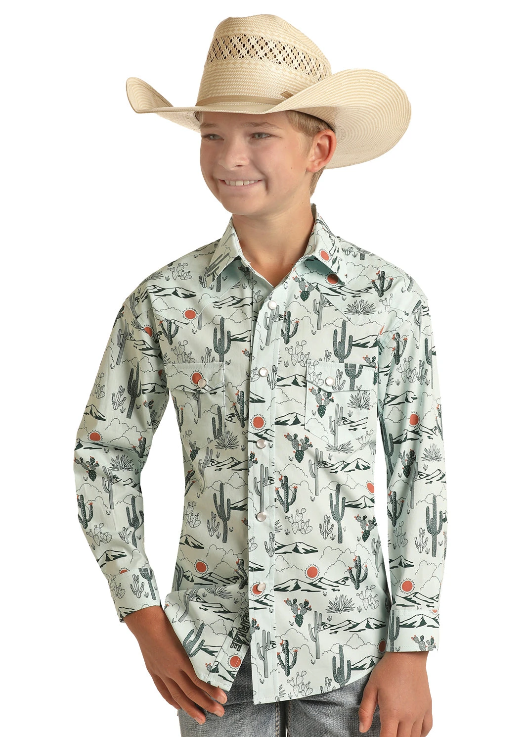 Mint Long Sleeve Snap Front Shirt with All Over Cactus and Desert Print.