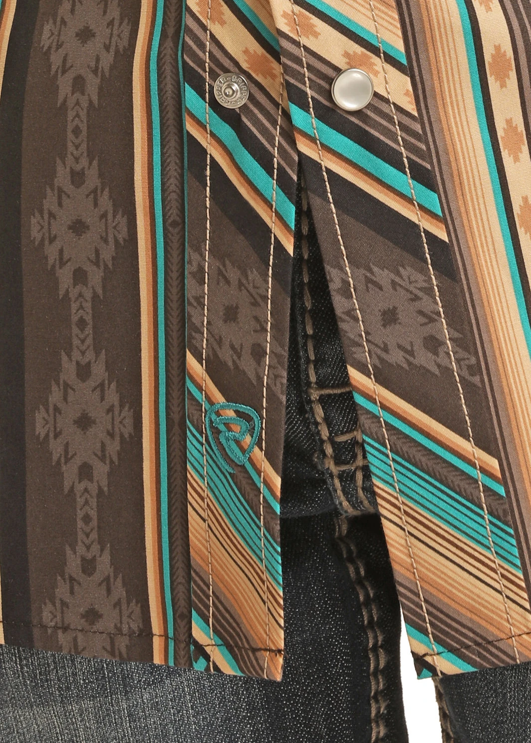Chocolate, Tan and Teal Aztec Stripe Print Long Sleeve Snap Front Shirt.