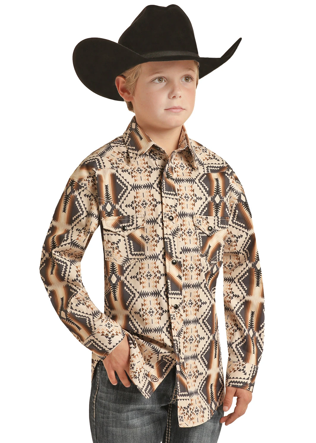 Natural and Brown Aztec Long Sleeve Snap Front Shirt.
