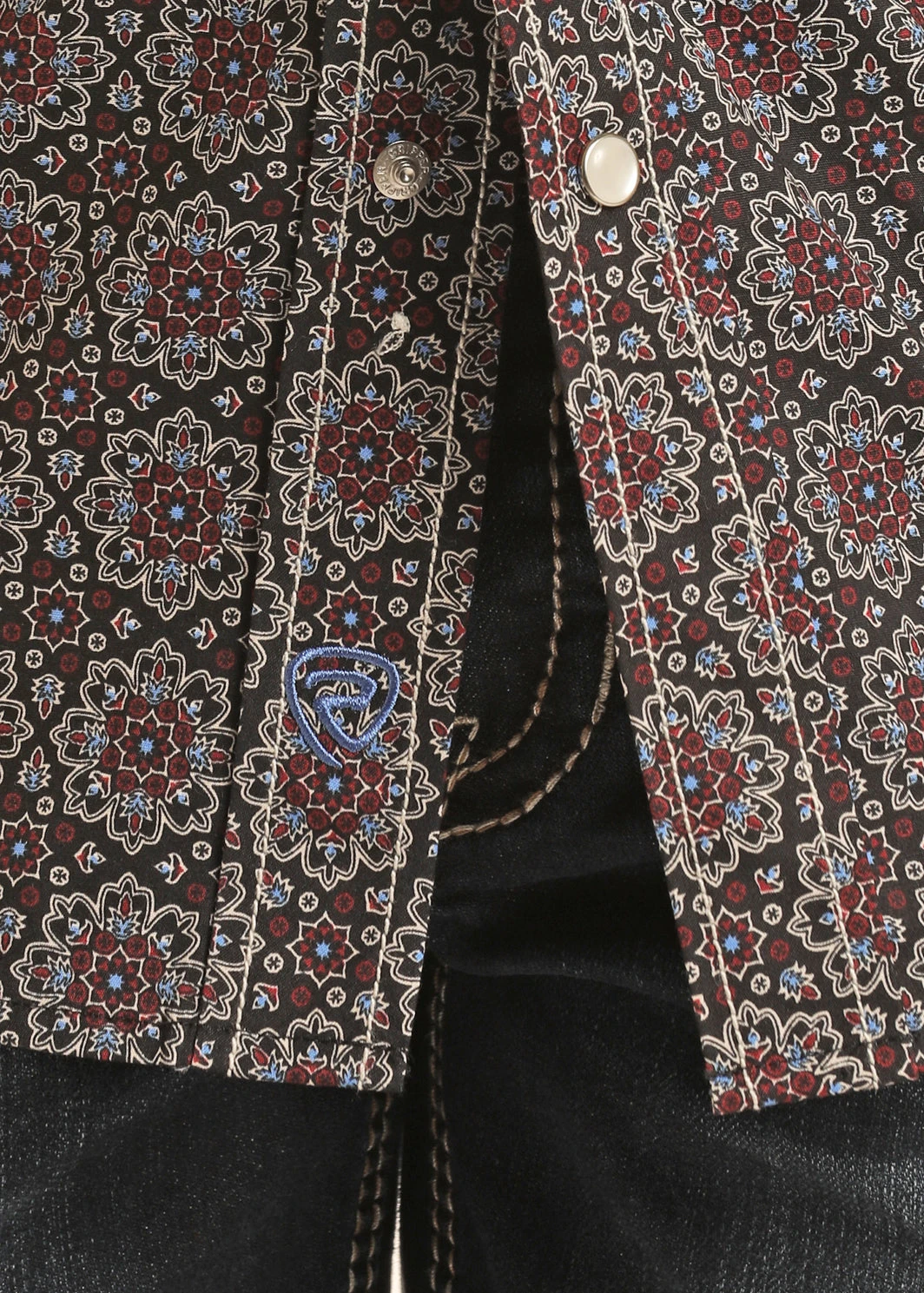 Maroon Medallion Print Long Sleeve Snap Front Shirt.