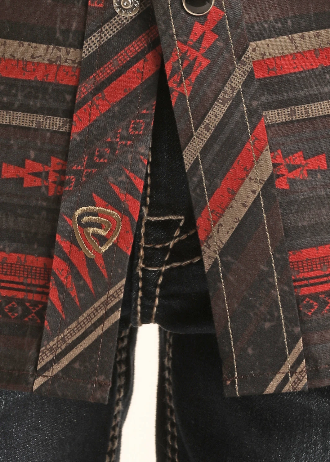 Brown and Red Aztec Stripe Long Sleeve Snap Front Shirt.