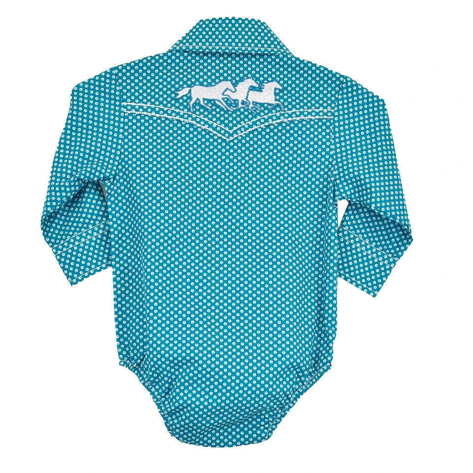 Turquoise and White Donut Print Ling Sleeve Romper with Running Horse Embroidery.