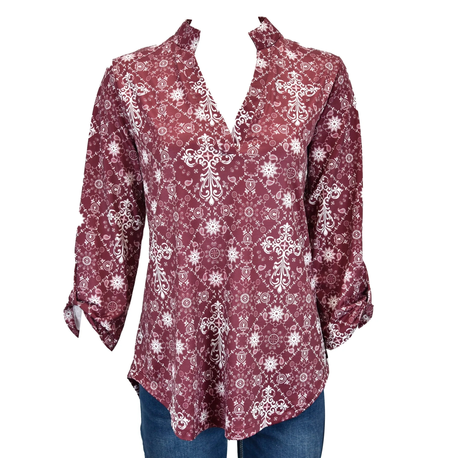 Burgundy Bandana Cross Long Sleeve Blouse.