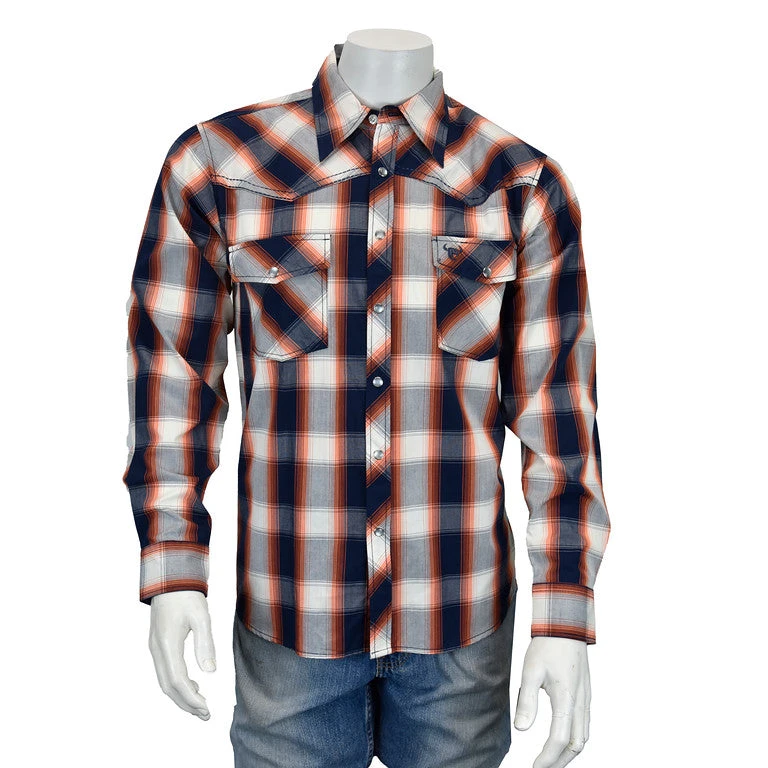 Orange and Blue Hombre Plaid Long Sleeve Snap Front Shirt.
