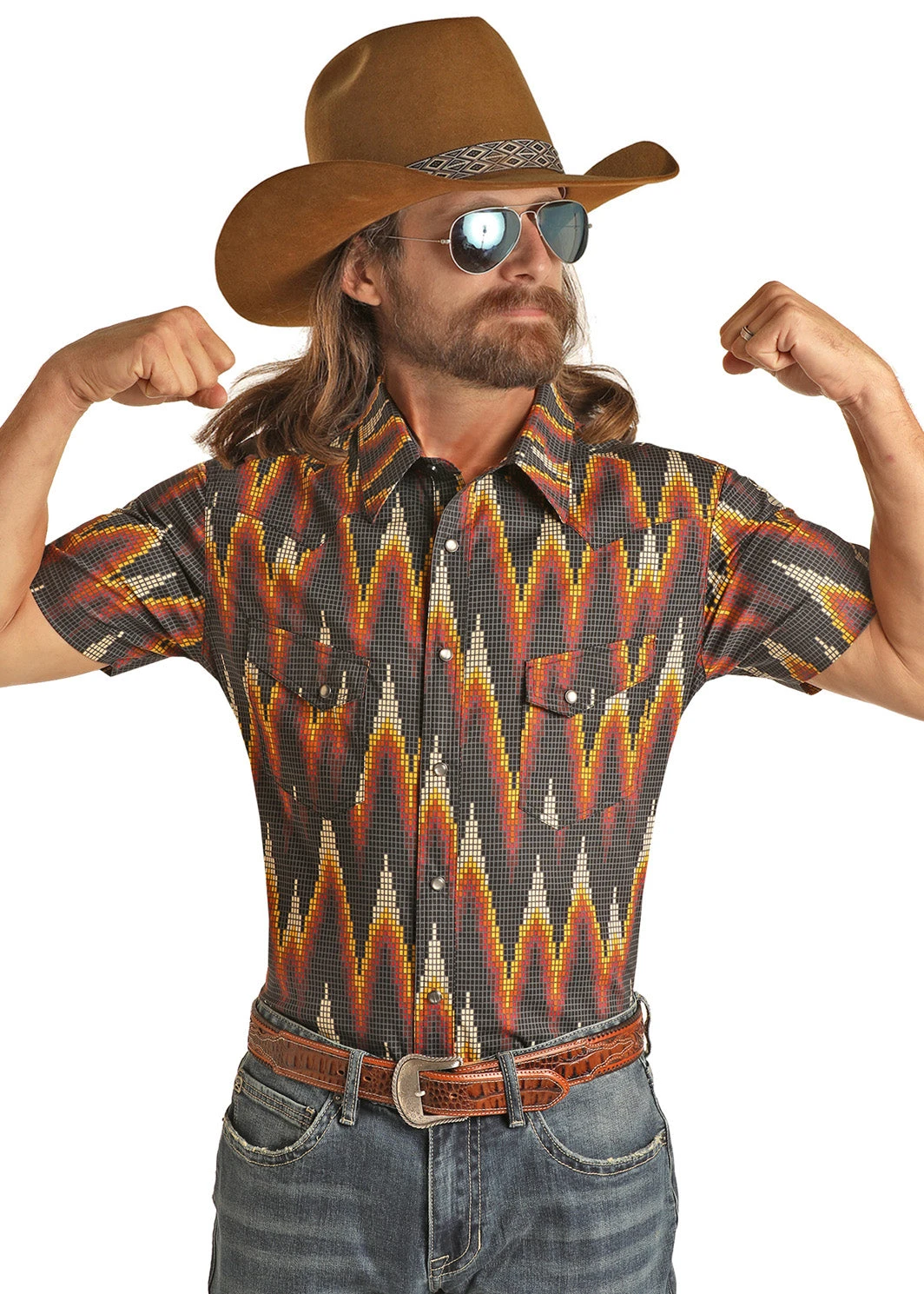 Dark Gray and Multi Color Digital Aztec Print Short Sleeve Snap Front Shirt.