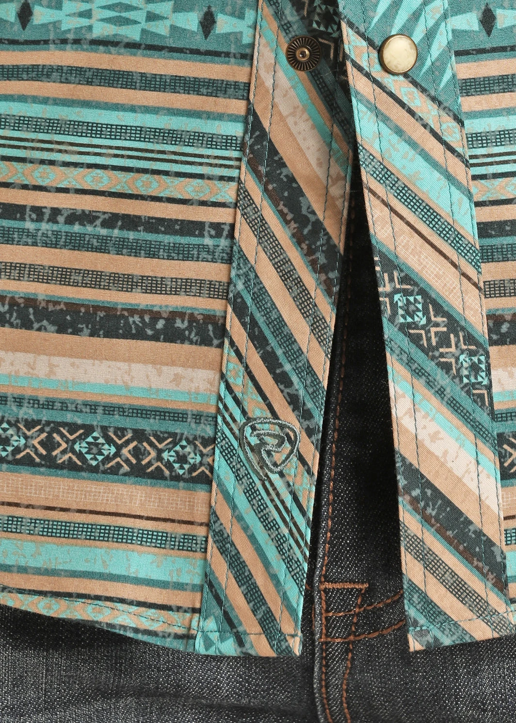 Tan and Multi Turquoise Aztec Stripe Long Sleeve Snap Front Shirt.
