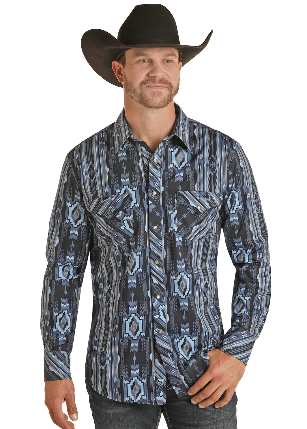 Blue Aztec Print Long Sleeve Snap Front Shirt.