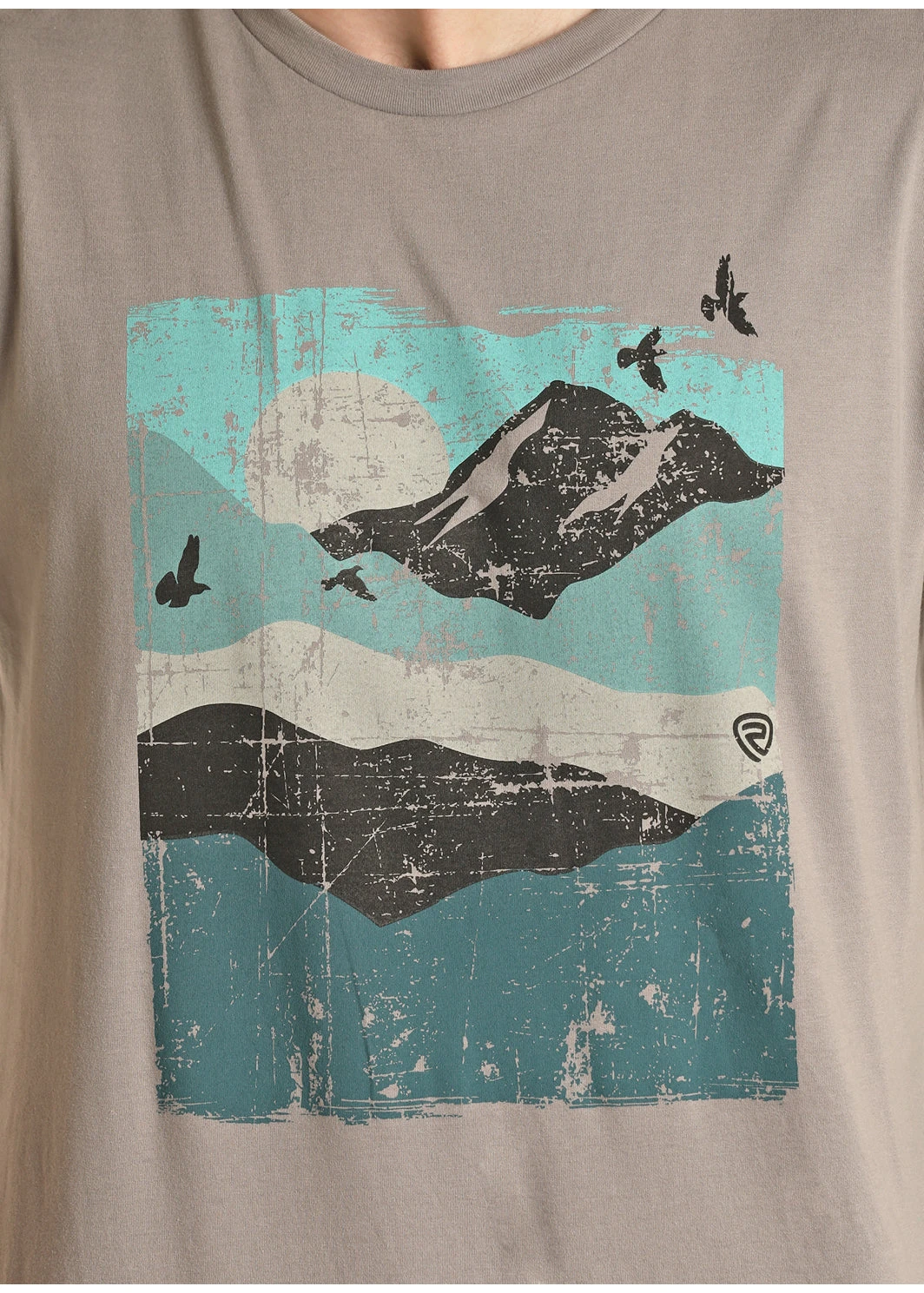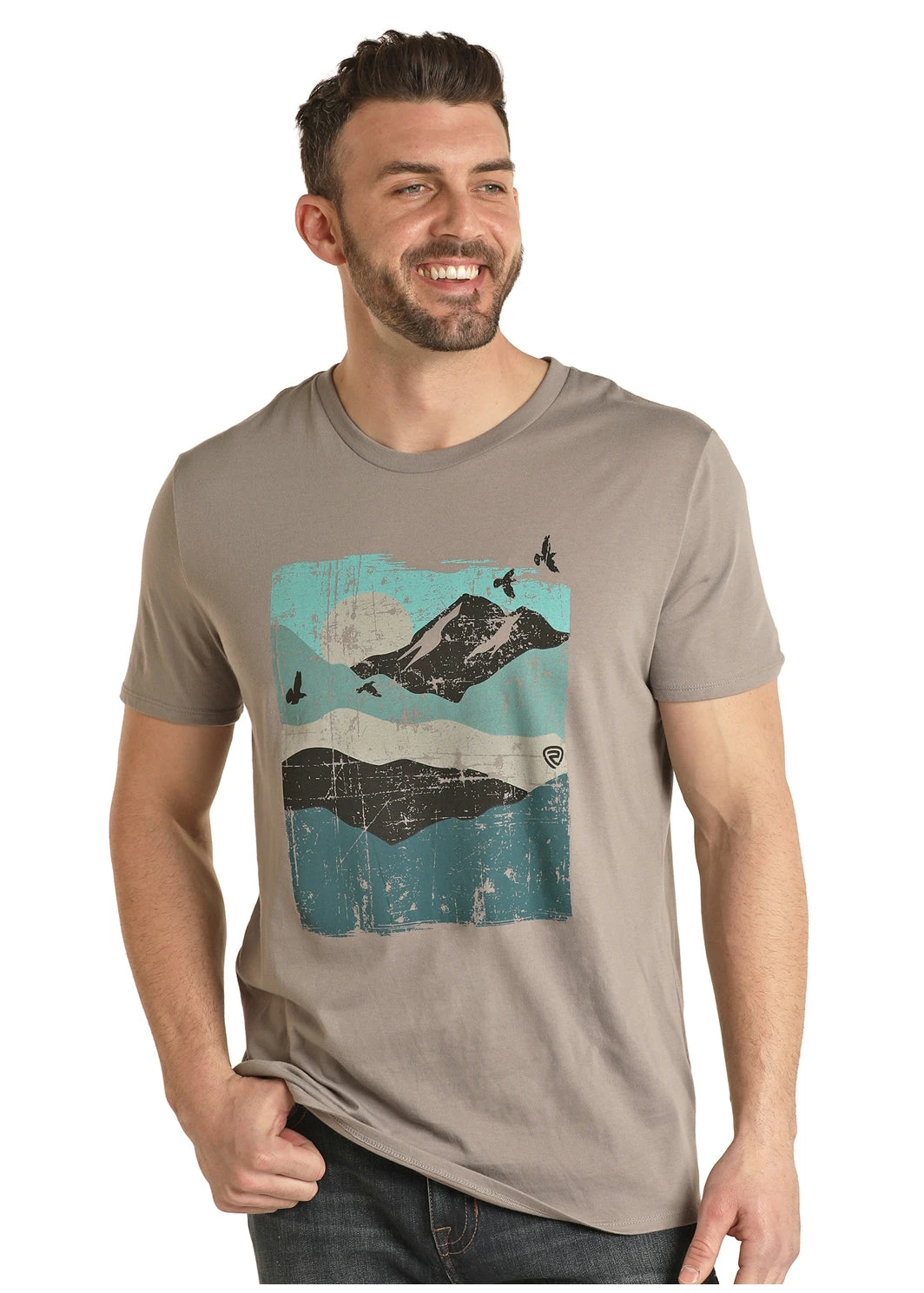 Grey Short Sleeve Mountain Scene Screen Print T-Shirt.