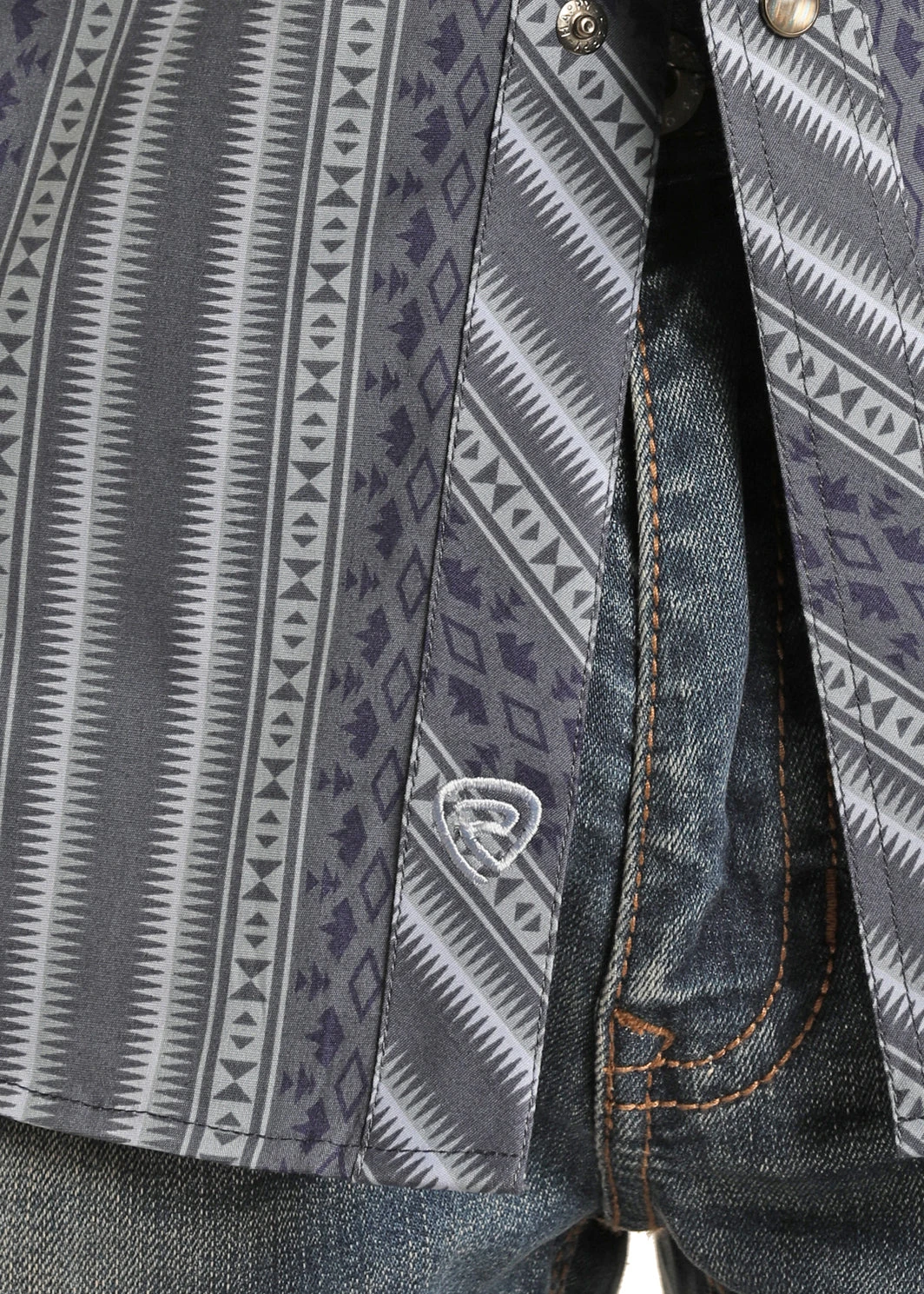 Blue and Grey Aztec Stripe Long Sleeve Snap Front Shirt.